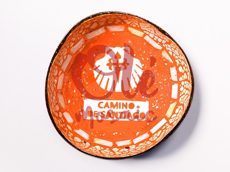Orange coconut bowl inspired by the Camino de Santiago, crafted from a natural shell. This original bowl stands out for its vibrant orange color and decorative design, which includes the famous pilgrim’s symbol. The base features a textured rim in warm tones, adding a rustic and authentic touch. Ideal for display or as a practical container, this bowl represents the essence of the Camino tradition in every detail.