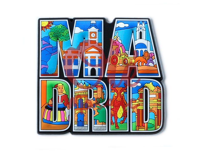 PVC magnet with a colorful panoramic view of Madrid that captures the essence of the Spanish capital. This vibrant magnet features the word “MADRID” in large letters, decorated with emblematic illustrations such as the Cibeles Palace, the Bear and the Strawberry Tree, and a flamenco dancer in a traditional costume. With its bright tones and artistic details, it is an excellent souvenir that highlights Madrid’s cultural and architectural richness, perfect for adorning any metallic surface.