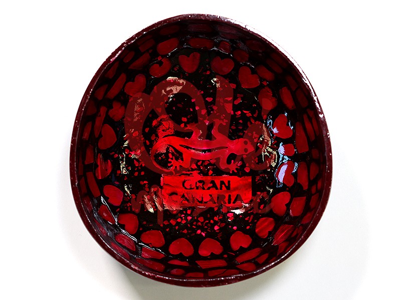 Red coconut bowl decorated with a striking salamander, representing the culture of Gran Canaria. This handcrafted item, made from coconut, stands out for its vibrant red color and the heart-shaped motifs adorning its base. In the center, the figure of a salamander next to the text “Gran Canaria”, both hand-painted with great detail. Perfect as a souvenir or decorative item, it reflects the charm of Canarian folklore.