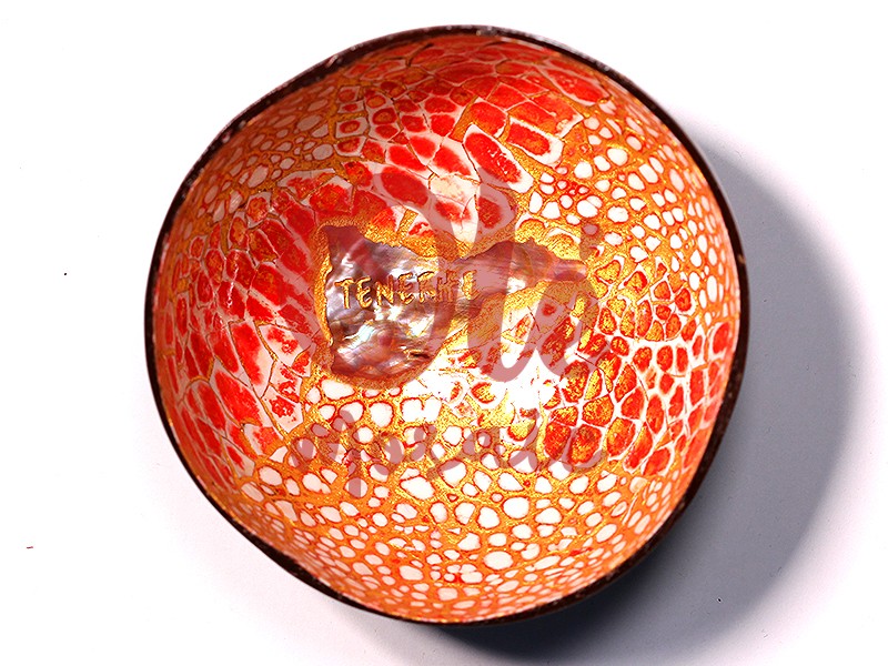 Artisanal red coconut bowl, inspired by the vibrant essence of Tenerife. This attractive bowl, crafted from coconut shell, features a decorative handcrafted design, hand-painted in red and orange tones, with motifs that evoke the texture of Canarian nature. The pearlescent image of the island of Tenerife stands out, surrounded by golden details, making it a unique piece, ideal for decorating any space or as a special gift.
