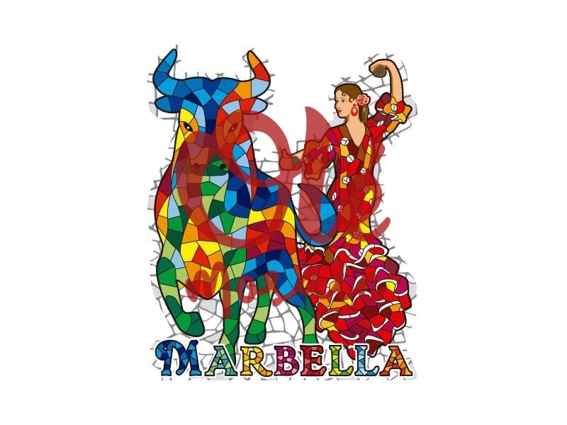 Colorful magnet depicting a bull and a flamenco dancer, inspired by Marbella culture. This attractive souvenir captures the Andalusian essence with its vibrant and stylized design, blending red, yellow, and blue tones in a finish that evokes traditional ceramics. The flamenco dancer, with her ruffled dress, displays her grace in a dynamic pose, while the bull accompanies her with its imposing presence, all complemented by the name “Marbella” at the base.