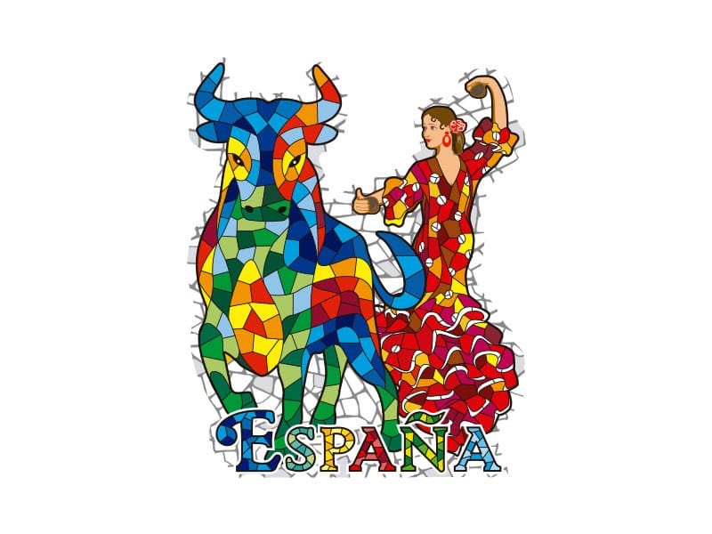 Magnet that captures the essence of Spain, presented with a vibrant design featuring a bull and a flamenco dancer. This attractive magnet is decorated with vivid colors and a mosaic style that brings to life the elegant movements of the flamenco dancer, adorned with a red ruffled dress. Below the image, the word “ESPAÑA” stands out, a representative touch of Spanish culture. Ideal for decorating any metallic surface and bringing a piece of Spain to your home.