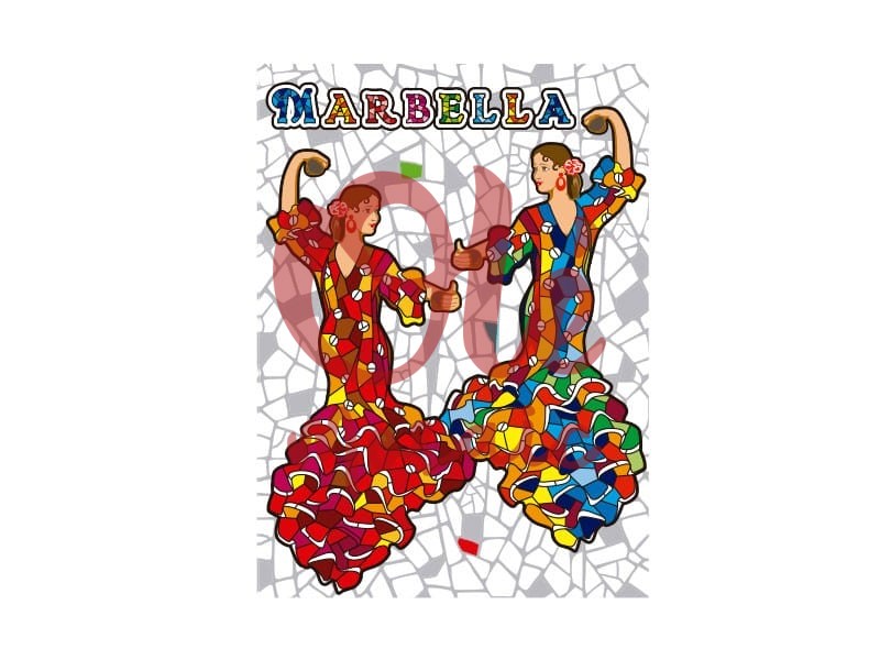 A magnet that captures the essence of Marbella through two elegant flamenco dancers. It measures 7.5 cm and features a vibrant design with ruffled red and blue costumes, adorned with striking colors that evoke the joy of Andalusian folklore. The mosaic background enhances the charm of the region, while the name “MARBELLA” is displayed in multi-colored letters, making this magnet a perfect souvenir of Andalusian cultural tradition.