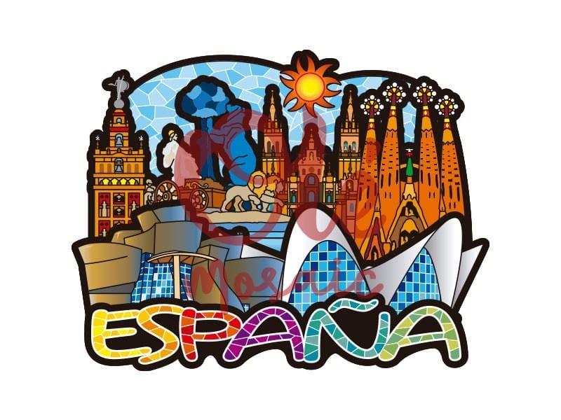 Magnet with a vibrant panoramic view representing emblematic monuments and landscapes of Spain. This item features a colorful design that includes the Sagrada Familia, Casa Batlló, and other architectural icons, along with the text “ESPAÑA” in bright colors. The subsequent framing technique simulates a stained-glass window, while embossed details add depth and visual appeal. Perfect for remembering the beauty of Spain anywhere.