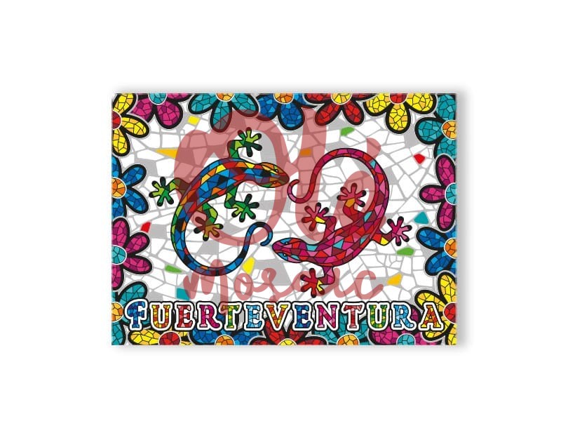 Magnet decorated with a colorful representation of two salamanders among flowers, inspired by the natural landscape of Fuerteventura. This 7.5 cm magnet stands out for its vibrant design, with geometric shapes in blue, red, green, and yellow tones framing a mosaic background, evoking traditional Canarian tiles. The word “Fuerteventura” appears in large, cheerful letters, making this souvenir an attractive piece for any lover of the Canary Islands.