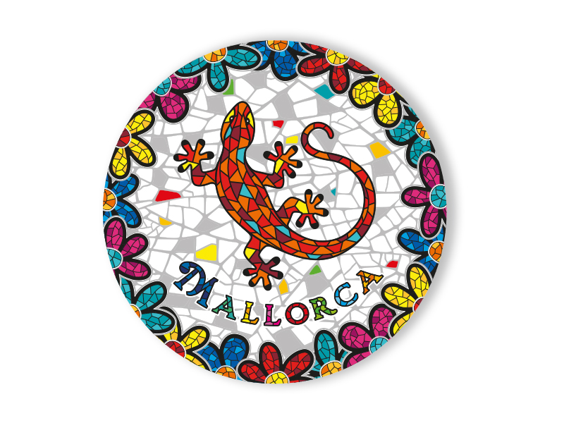 Resin magnet decorated with a vibrant salamander in the center, surrounded by colorful flowers, representing the charm of Mallorca. With a diameter of 6.5 cm, this magnet is a distinctive piece that captures the essence of Balearic biodiversity and culture. The illustration of the salamander, with its orange tones and stylized details in a mosaic design, contrasts with a cheerful color palette background, which includes an exquisite flower pattern in reds, yellows, blues, and pinks. This design not only stands out for its aesthetics but also symbolizes the flora and fauna of the region, making this magnet a significant souvenir of Mallorca, ideal for those looking for an authentic memento that represents their trip to the Balearic Islands.