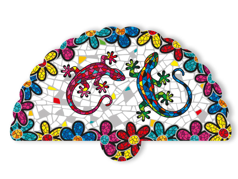 Resin magnet with salamanders and flowers. This vibrant magnet captures the essence of rich Andalusian culture, blending natural elements with the colorful ceramic style so characteristic of the region. Featuring a colorful, hand-painted design, it showcases two salamanders in red and green hues that seem to come alive amidst an exuberant mix of flowers on a mosaic base. The intense colors of the red, blue, and green details invite admiration, reflecting the creativity and artistic passion that permeates Spanish decorative art.