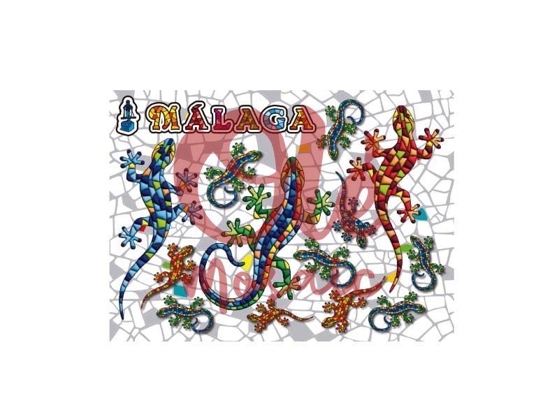 Magnet with a colorful salamander design, evoking the essence of Malaga. This attractive 7.5 cm magnet features salamanders with vibrant designs in blue, green, and red, adorned with floral details in contrasting colors. The magnet’s base showcases a mosaic that evokes the city’s rich cultural history. Ideal for taking an emblematic souvenir of Andalusia home or as a gift for those who appreciate local art.