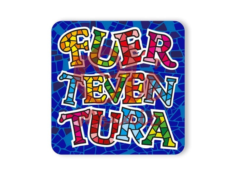 Magnet with a colorful sign featuring the name “Fuerteventura” in large, vibrant letters. This attractive souvenir has a blue background adorned with a design reminiscent of traditional mosaics. The letters are painted in different colors, combining visual elements that evoke the energy and landscape of the Canary Island. Ideal for remembering your trip or as a unique gift that reflects the essence of Fuerteventura.
