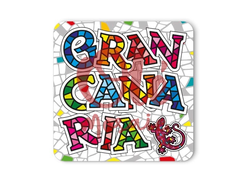 Magnet with the “Gran Canaria” sign, colorful and vibrant. This attractive souvenir features large, stylized letters, decorated with mosaics in red, blue, green, and yellow tones, evoking Canarian folklore. The white background simulates a stone wall with bright colored details, and a friendly lizard peeks out with a floral design. Perfect for remembering the beauty and culture of Gran Canaria on any metallic surface.