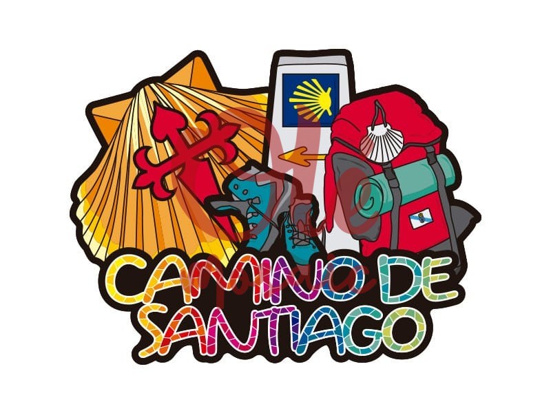 Magnet inspired by the Way of St. James, designed with iconic elements of the route. This attractive magnet features a scallop shell, a symbol of pilgrimage, along with a backpack, a pair of hiking boots, and a directional sign. The text “CAMINO DE SANTIAGO” (Way of St. James) is displayed in vibrant colors, complementing the artistic motifs. This souvenir is perfect for remembering the adventure of the Way and its rich cultural tradition.