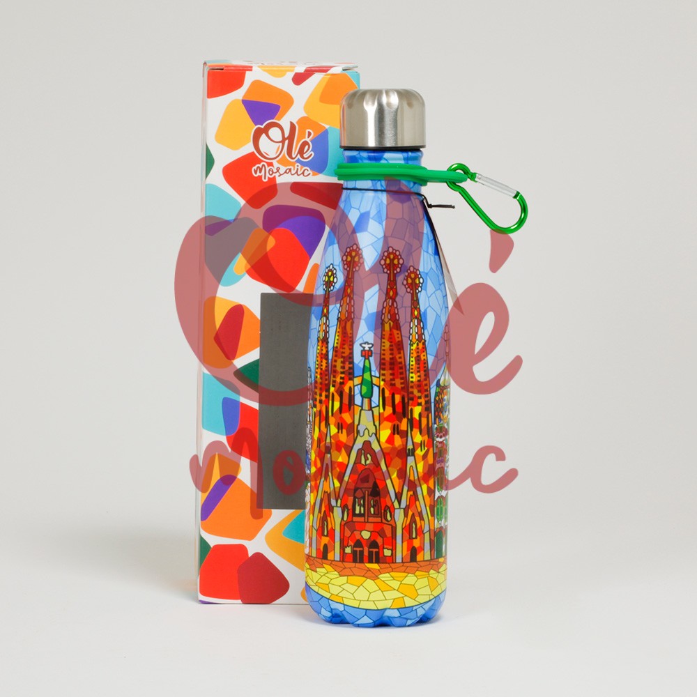 500 ml stainless steel bottle, decorated with a vibrant panoramic view of Barcelona’s Sagrada Familia. This colorful and modern design features a mosaic style that evokes Gaudí’s iconic work, with details in blue, red, and yellow tones that capture the city’s essence. Equipped with a steel lid and a practical carabiner, it’s ideal to take on any adventure, while enjoying an artistic and cultural touch.