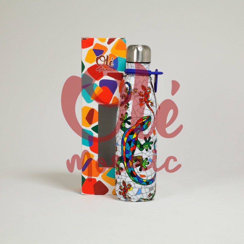 This 350 ml stainless steel bottle, decorated with a vibrant salamander design, is a tribute to the magnificent work of the famous modernist architect Antoni Gaudí, an emblem of Barcelona. Its shiny finish features a colorful illustration that integrates red, blue, and green details, evoking the uniqueness of the Park Güell mosaic. The salamander, with its extended body and captivating geometric pattern, not only represents the creativity of modernist art but also symbolizes the connection of nature with the urban environment, one of the key characteristics of Gaudí’s design.