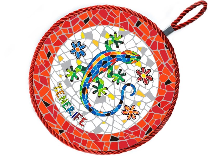 This ceramic trivet, inspired by the emblematic salamander of Tenerife, is a magnificent example of the Canary Islands’ cultural richness, ideal for tourists looking for authentic souvenirs. With a vibrant design, this item features a colorful salamander in blue, green, and yellow tones, capturing the essence of the local fauna, surrounded by charming red and blue flowers. The mosaic background, with gray and white tones, offers an attractive contrast, enhancing the central figure and creating a visually captivating work of art. The word “Tenerife” is printed in striking letters, adding a touch of authenticity and geographical connection.