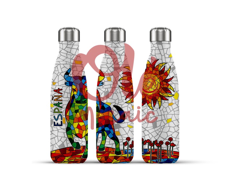 500 ml stainless steel bottle decorated with a vibrant design inspired by Spanish culture. It features a bull in a mosaic of bright colors, a symbol of Spanish folklore. In the background, elements like red flowers and a radiant sun bring joy and warmth to the design. The bottle is ideal for keeping drinks at the desired temperature, combining functionality with a unique visual appeal.