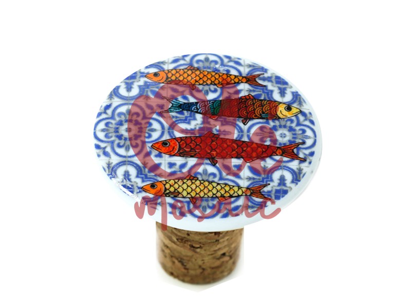 Ceramic stopper decorated with a vibrant sardine design, perfect for sealing your bottles with a touch of style. Inspired by Spanish tradition, it features a cork base and a white ceramic top adorned with sardines in red, orange, yellow, and green, set against a blue and white tile background. This stopper combines functionality and art, adding a distinctive detail to your kitchen accessories collection.
