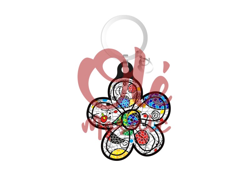 Wooden flower-shaped keychain, designed with a vibrant mosaic of colors that evokes Gaudí’s art. This accessory stands out for its intricate black design forming a beautiful pattern, with details in red, blue, yellow, and green. Ideal as a souvenir of Barcelona, this keychain is lightweight and practical, becoming a decorative piece that adds an artistic and colorful touch to your keys.