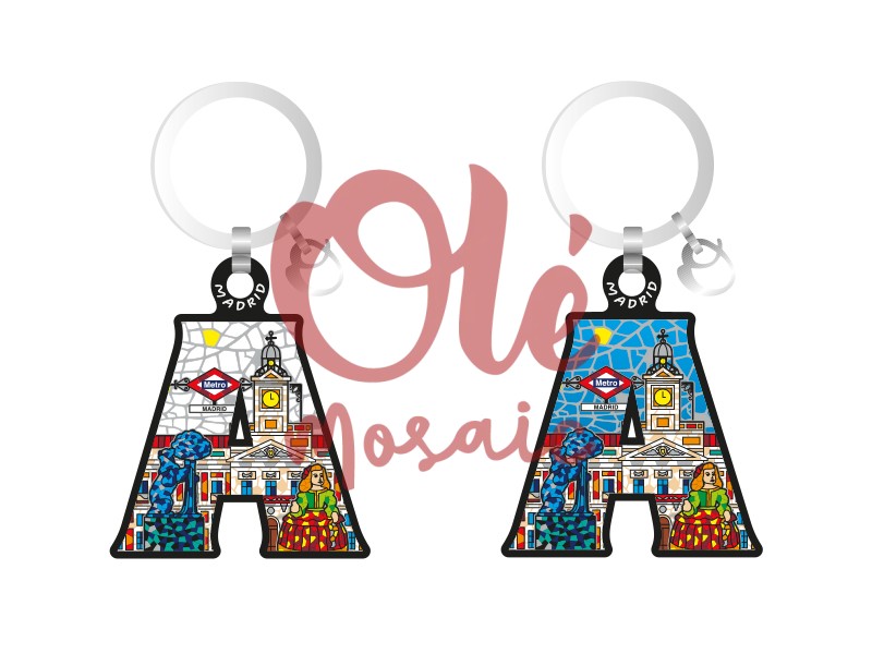 This wooden keychain with the letter “A” is a vibrant and representative souvenir of Madrid, designed to capture the essence of the Spanish capital. This attractive souvenir features a colorful and illustrative design that incorporates iconic elements of the city, such as the emblematic Puerta del Sol, represented through bright and detailed mosaics that highlight its unique architecture. The figures of the famous bears and strawberry trees (madroños), symbols of the city, stand out, along with other cultural elements that add an authentic touch to this piece.