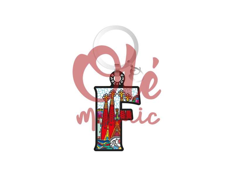 Wooden keychain in the shape of the letter “F”, inspired by Barcelona’s emblematic Sagrada Familia. This attractive souvenir features a colorful and vibrant design, with hand-painted details highlighting the majesty of the towers in red and gold tones, accompanied by decorative elements that evoke the city’s essence. With a sturdy metal ring, it is an ideal piece to carry a memory of Barcelona everywhere.