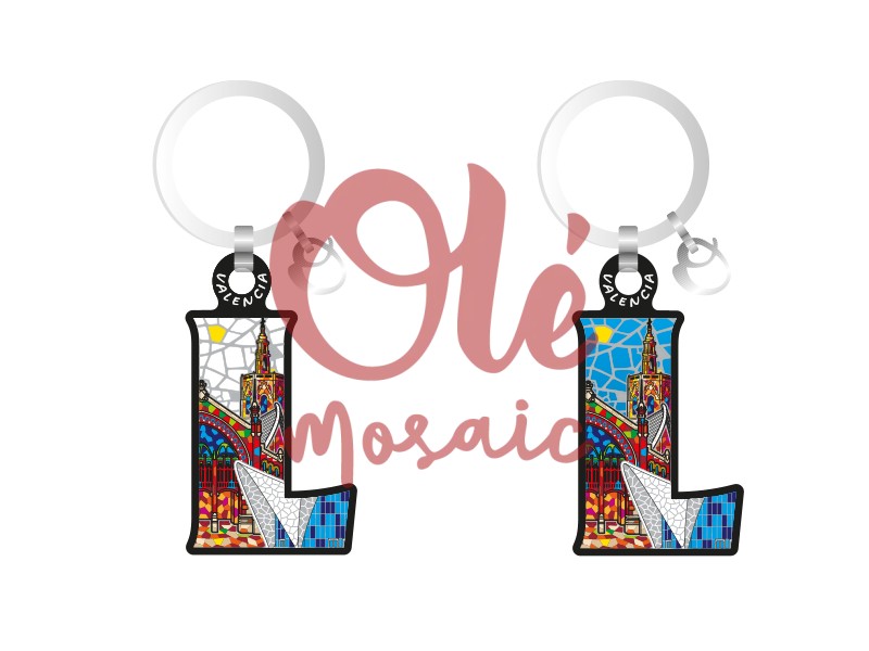 Wooden keychain with the letter “L”, inspired by the vibrant city of Valencia. This original design features colorful architectural motifs, such as the famous City of Arts and Sciences, complemented by traditional elements of the city. With a multi-color printing technique and mosaic details, this keychain combines functionality and art, becoming a perfect souvenir for those who wish to carry a piece of Valencia with them always.