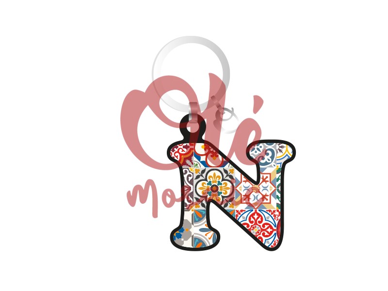 Wooden keychain in the shape of the letter “N”, decorated with a vibrant tile design that evokes Spanish cultural tradition. This keychain stands out for its bright colors, such as reds, yellows, and blues, which give it a cheerful and distinctive touch. Every detail of the pattern reflects Spain’s rich artistic heritage, making it an ideal souvenir for lovers of folklore and local craftsmanship. Its lightweight and durable design makes it perfect for carrying keys with style.
