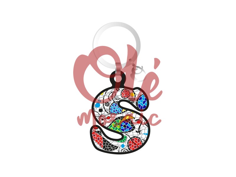 Wooden keychain in the shape of the letter S, inspired by Gaudí’s famous *trencadís*. This distinctive keychain features a colorful design combining red, blue, green, and black fragments on a white background. The finish highlights the uniqueness of each piece, making this accessory an ideal souvenir of Barcelona’s architecture. Light and functional, it’s perfect for organizing your keys with an artistic touch.