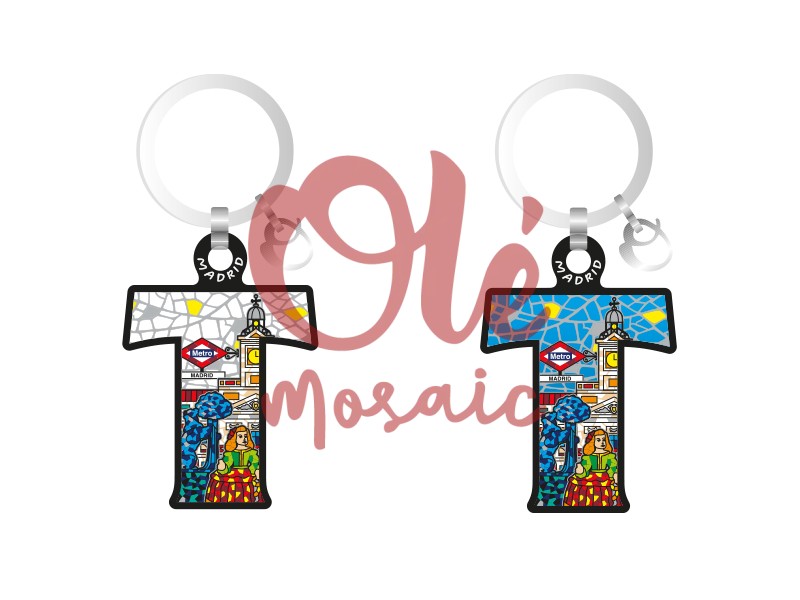Wooden keychain shaped like the letter “T”, representing the emblematic city of Madrid. This original keychain features a vibrant illustration with cultural motifs, displaying a picturesque scene with typical characters and iconic elements of the city, such as the metro station. Its colorful and detailed design, inspired by mosaic art, makes it an attractive souvenir perfect for remembering your visit to the Spanish capital.