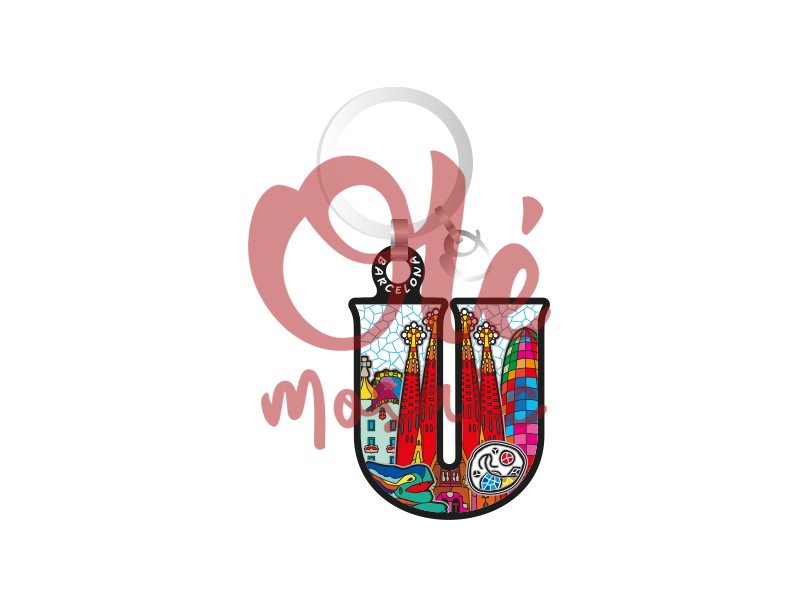 This wooden keychain, shaped like the letter “U”, is a charming souvenir that encapsulates the essence of the emblematic city of Barcelona. With a vibrant and colorful design, it features prominent illustrations of the Sagrada Familia, one of the city’s most iconic monuments, along with other representative elements of Catalan modernism, such as emblematic buildings and floral ornaments that evoke the cultural richness of the region. This keychain is a meticulously crafted wooden piece, whose glossy finish enhances the range of colors, making every detail visible and attractive.