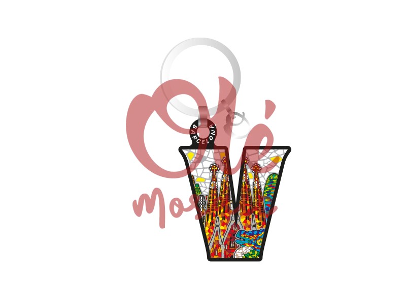 Wooden keychain shaped like the letter “V”, representing the emblematic city of Barcelona. This original accessory stands out for its vibrant and colorful design, with images of the Sagrada Familia and typical elements of modernist architecture. The keychain is an example of craftsmanship with hand-painted details, which gives it a unique and attractive touch. Ideal for carrying a piece of Barcelona with you, this keychain is the perfect souvenir.