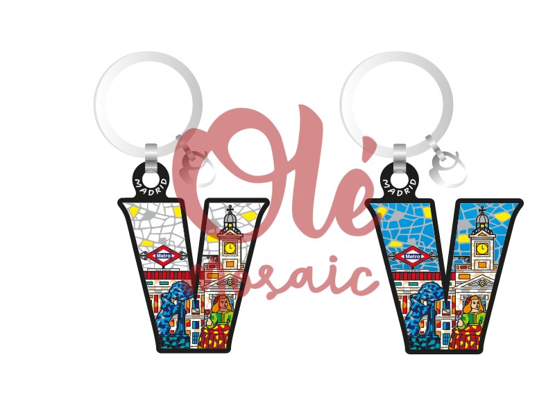 Wooden keychain in the shape of the letter “V”, inspired by the vibrant city of Madrid. This keychain features a colorful design with representative elements such as the famous Puerta del Sol, an emblematic clock, and a man dressed in traditional attire. Decorated with mosaics in blue and yellow tones, it is a functional and artistic item that captures the essence of Madrid’s heritage. Ideal as a souvenir or gift for lovers of the Spanish capital.