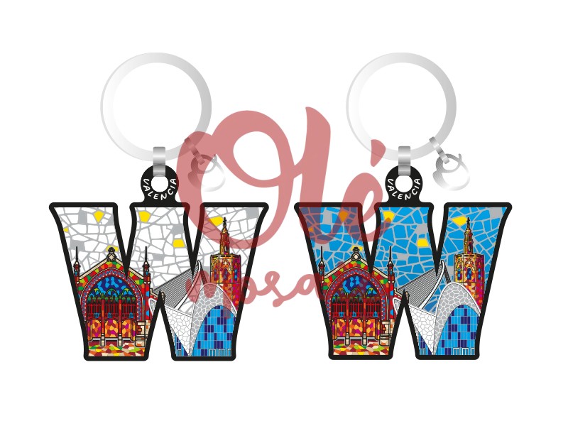Wooden keychain with the letter “W”, inspired by the city of Valencia. This keychain features a colorful design that combines iconic elements of the city, such as the Cathedral and the modern City of Arts and Sciences. Hand-painted with an artisanal style with details in red, blue, and gold, it highlights the architectural beauty and cultural richness of Valencia. A perfect souvenir that captures the essence of this vibrant city.