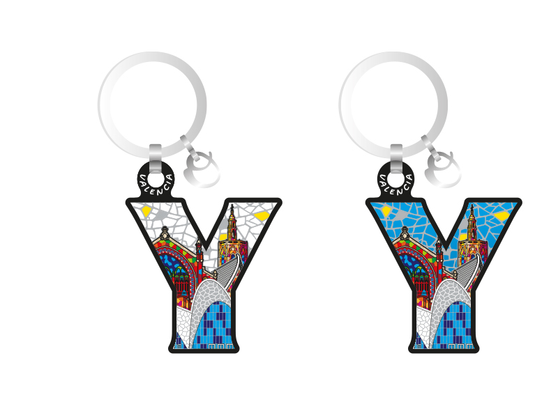 Wooden keychain in the shape of the letter Y, inspired by the city of Valencia. This striking keychain features a colorful design that highlights the city’s iconic architecture, including characteristic mosaics and details of its most emblematic monuments. With a glossy finish and a contemporary style, it is a perfect souvenir that combines the elegance of Valencian art with the functionality of a practical keychain. Ideal for those who wish to carry a piece of Valencia with them.