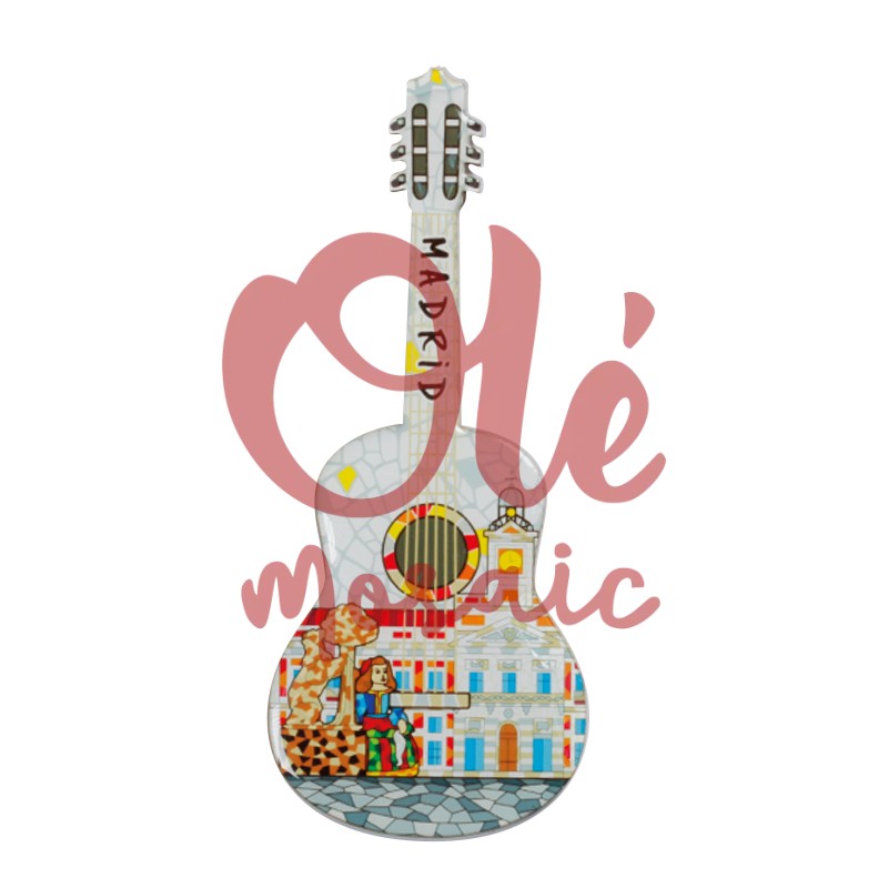 Guitar-shaped wooden magnet, representing the essence of Madrid. This original souvenir is decorated with a vibrant mosaic that includes the illustration of an emblematic monument and a figure dressed in traditional attire. The design features vivid colors and distinctive details at the top, with the inscription «MADRID», uniquely capturing the city’s cultural identity. Perfect for remembering your visit to the Spanish capital.