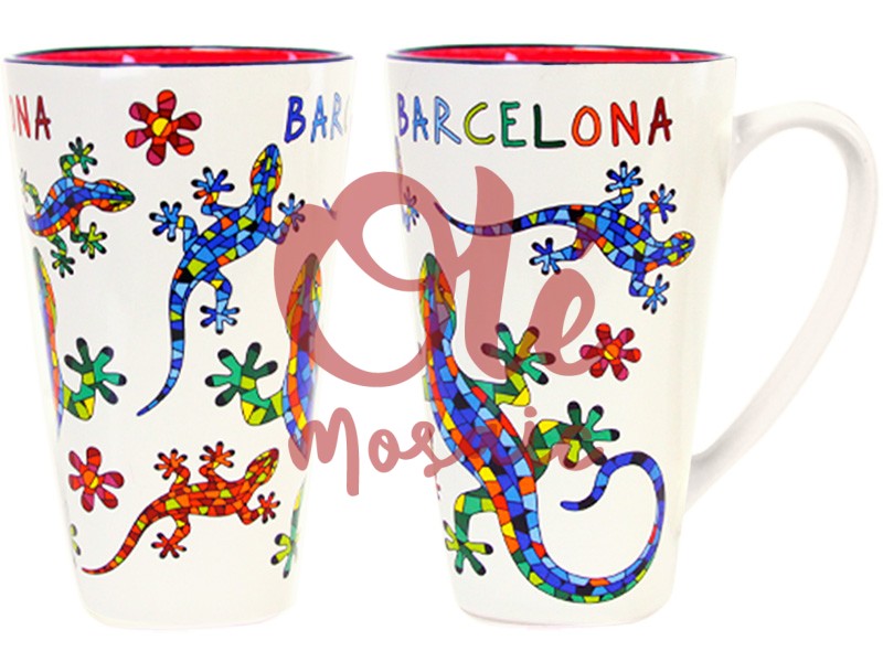 XL ceramic mug decorated with attractive salamander motifs, inspired by the uniqueness of Barcelona. This colorful design combines mosaic pieces representing three salamanders in blue, green, and red tones, along with multicolored flowers. The beige background highlights the illustrations, while the edges feature a vibrant red finish. Ideal for enjoying your favorite beverages, this mug is a perfect souvenir of the city’s artistic essence.