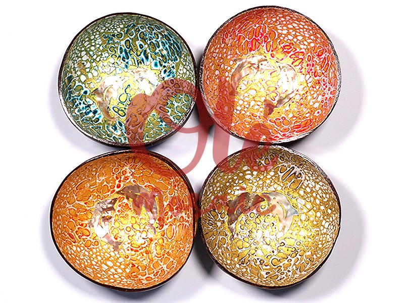13 x 6 cm coconut bowls, decorated with dolphin motifs, ideal for adding a maritime touch to any space. Each of the four bowls features vibrant colors in shades of green, orange, yellow, and red, with a glossy finish that enhances the dolphin details. Their handmade, hand-painted artisanal design reflects traditional craftsmanship, making them perfect for serving appetizers or as decorative items.