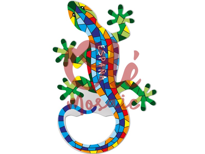 Metal bottle opener with a salamander design, crafted from epoxy resin, ideal for opening bottles with style. It features a colorful and vibrant representation of a salamander, adorned with a mosaic of blue, green, yellow, and red tones, evoking Spanish art. In the center, the word “ESPAÑA” reinforces its tourist appeal. This original opener is both functional and decorative, perfect for collectors and lovers of Iberian culture.