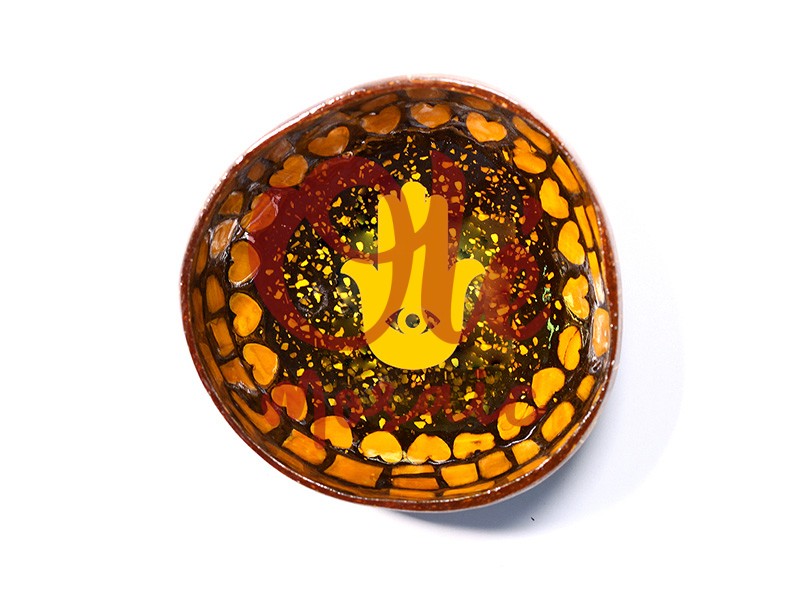 This yellow coconut bowl, hand-decorated, is a jewel of Spanish popular art, ideal for those seeking authentic souvenirs representative of local culture. With a central design featuring a hand with an eye, a symbol known for its association with protection and good luck, it conveys a positive and hopeful message. Around the hand, a charming border of hearts, all in a vibrant bright yellow that stands out against the brown color of the bowl’s base, creates an attractive and warm visual contrast.