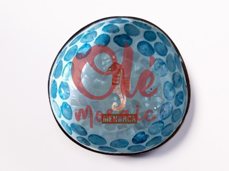 Blue coconut bowl decorated with a charming seahorse, representing the marine beauty of Menorca. This artisanal product stands out for its handcrafted, hand-painted design in various shades of blue, complemented by a dark rim that enhances its elegance. At the center, the seahorse, a distinctive symbol of the Mediterranean, is accompanied by the text “MENORCA,” creating a piece that is both decorative and representative of local culture. Ideal as a souvenir or to add a Mediterranean touch to any home.