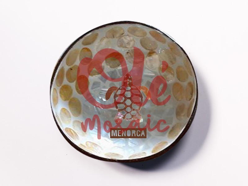 Beige coconut bowl, inspired by Menorcan nature. This elegant bowl features a very special design with turtles and a smooth, glossy finish that enhances its natural texture. The interior displays a beautiful pattern in beige and yellow tones, evoking the sand of the island’s beaches. A unique souvenir that captures the essence of Menorca, ideal for decorating your home or serving appetizers.