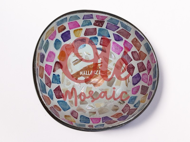 Coconut bowl decorated with a colorful mosaic that evokes the splendor of the island of Mallorca. This unique container features a variety of fragments in vibrant shades of pink, blue, and purple, arranged on a white background, which enhances its visual appeal. In the center, the island’s silhouette in copper color and the word “MALLORCA” stand out, adding a distinctive touch. Handmade, it is ideal as a decorative item or for serving appetizers.