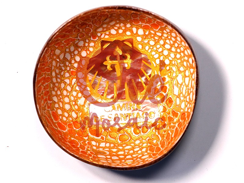 Orange coconut bowl decorated with the Camino de Santiago symbol. This attractive handcrafted object features a bright finish in orange tones and an intricate design that evokes the essence of the famous Spanish pilgrimage. The piece stands out for its engraving technique, which highlights the text “Camino de Santiago” and the iconic emblem of the path. Cheerful and distinctive, this bowl is an excellent souvenir that combines tradition and originality.