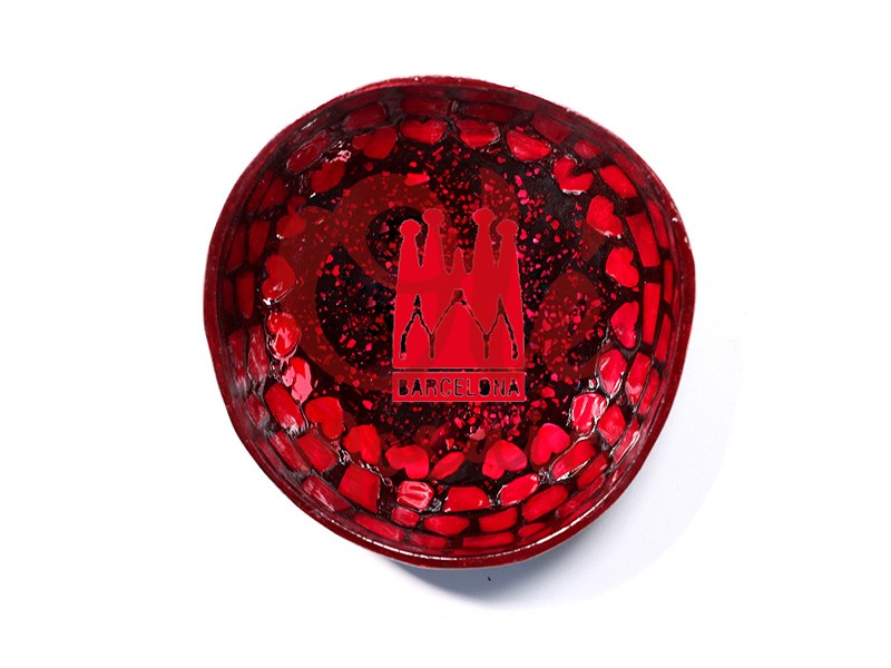 Red coconut bowl, inspired by Barcelona’s iconic Sagrada Familia. This striking bowl features an elegant design with a brilliant red finish and black details that evoke the city’s vibrant colors. At its center, an engraving of the Sagrada Familia is combined with a decorative border that mimics mosaic work. Ideal for serving appetizers or as a decorative piece, it adds a touch of Catalan authenticity to any home.