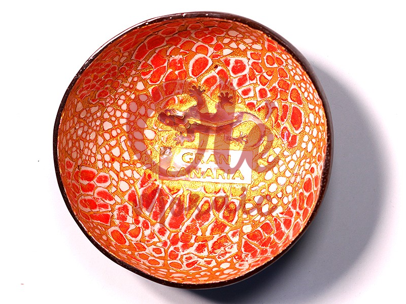 Decorated red coconut bowl, inspired by the fauna of Gran Canaria. This attractive bowl, made from a coconut shell, features a vibrant design with red and gold patterns that evoke the colorful Canary landscape. The emblematic salamander, a symbol of the island, stands out, accompanied by the inscription “Gran Canaria.” A unique souvenir that captures the essence of the island and is ideal for any corner of the home.