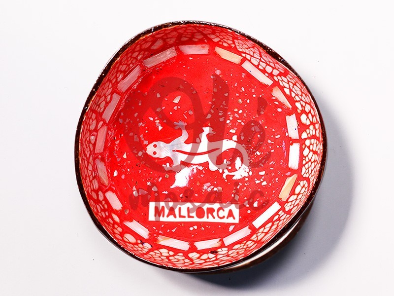 Red coconut bowl decorated with a salamander, representative of Mallorca’s fauna. This exquisite handcrafted item, designed by hand, features a vibrant red hue with white details that highlight the salamander’s figure, along with the text “MALLORCA”. Its oval shape and embossed decorative elements evoke the island’s cultural richness, making it an attractive souvenir ideal for lovers of Mallorcan craftsmanship and folklore.