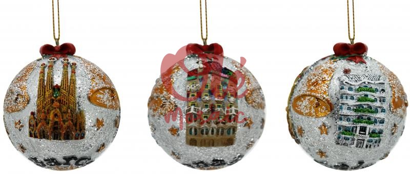 Decorative Christmas bauble inspired by Barcelona’s Casa Batlló, crafted from glass with a glossy finish. This beautiful sphere features hand-painted effect illustrations of Gaudí’s famous architecture, accompanied by golden sparkles and red details. With representations of the Sagrada Familia, Casa Batlló, and other iconic elements, it is a festive ornament that captures the essence of Catalan modernism, ideal for adding an artistic touch to your Christmas tree.