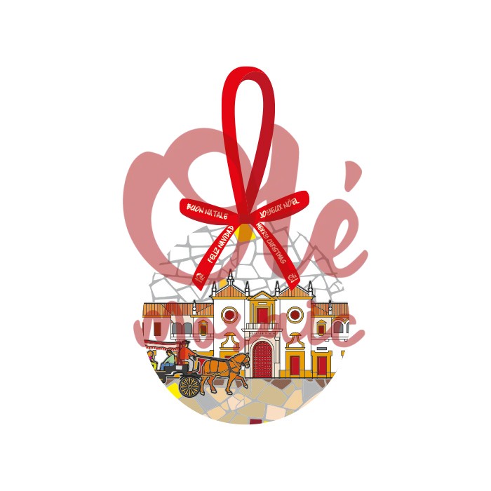 Decorative Christmas ball presented in an elegant box, with a beautiful panoramic view of Seville. Made of ceramic, this ball features a vibrant illustration of iconic Sevillian architecture and a horse-drawn carriage, capturing the essence of Andalusian folklore. With a colorful design and a glossy finish, it is completed with a red ribbon, perfect for decorating your Christmas tree or as an unforgettable gift.
