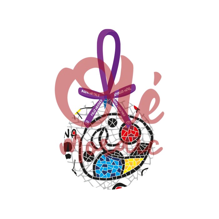 Decorative Christmas ball celebrating Gaudí’s iconic style in Barcelona. This attractive ornament features a vibrant design inspired by the city’s characteristic mosaic architecture, with blue, red, and yellow colors contrasting against a white background, evoking the beauty and cultural significance of the tiles from emblematic structures like Park Güell. The ball, which includes an elegant box decorated with a purple bow, is ideal for decorating the Christmas tree, adding a touch of art and culture to your winter celebrations. Its design stands out for its intricate details that pay homage to Gaudí’s unique style, merging tradition and modernity into a piece that will be remembered. This souvenir is not just a decorative item, but a symbol of Barcelona’s rich cultural heritage, making it the perfect gift for those seeking a deeper connection with the city. At Olé Mosaic, we pride ourselves on offering authentic and representative souvenirs, such as this Christmas ball, ideal for tourist gift shops that wish to present products celebrating local culture and art.