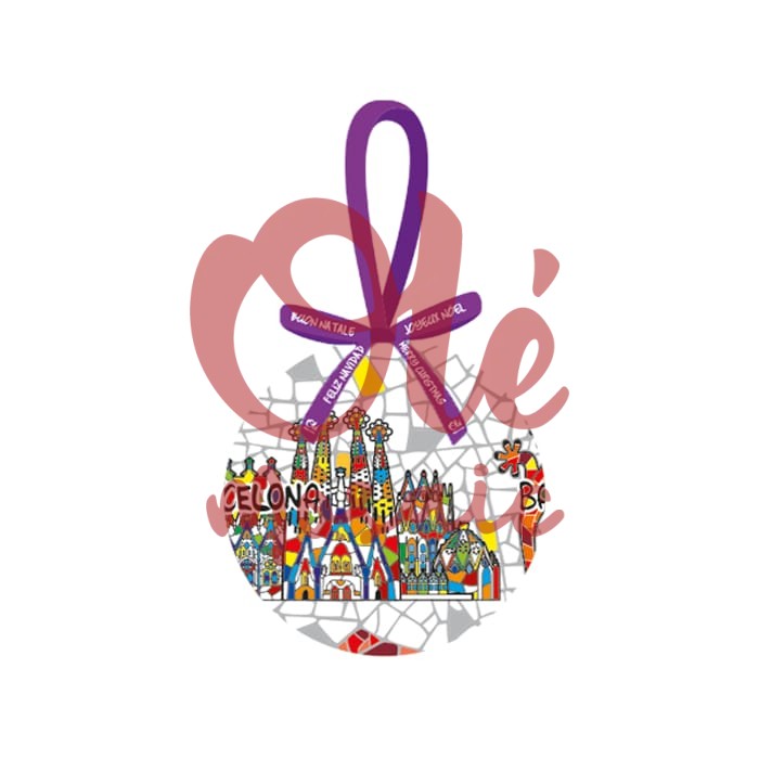The bauble’s background suggests a mosaic reminiscent of the cathedral’s colorful stained glass windows, while its striking shades of red, blue, yellow, and green evoke the warmth and creativity of Barcelona. It includes a purple ribbon which, in addition to making it easy to hang on the tree, adds a festive touch, allowing this bauble to become the centerpiece during Christmas celebrations.