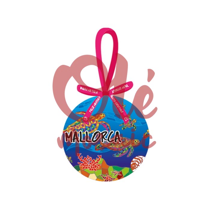 Decorative Christmas bauble presented in an elegant box, inspired by the natural beauty of Mallorca. This spherical ornament is illustrated with vibrant sea turtles on a blue background that evokes the waters of the Mediterranean. Coral motifs and marine elements complement the design, offering a cheerful and festive touch. The pink ribbon adds a charming detail, ideal for decorating any Christmas tree.