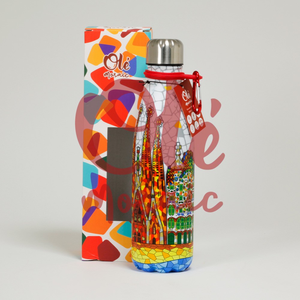 500 ml stainless steel bottle with a beautiful panoramic view of Barcelona. This vibrant and colorful design features iconic architectural works, such as the Sagrada Familia, adorned with mosaic details that evoke Antoni Gaudí’s style. The bottle, ideal for keeping your drinks at the desired temperature, combines functionality and art, making it a perfect souvenir that captures the essence of this vibrant city.